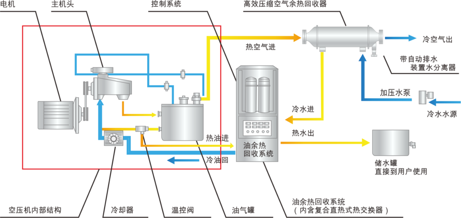 减轻冷却系统负荷:余热回收系统带走了大部分热量,使空压机的油温和气温保持在最佳工作区间,大大减轻了原装冷却系统(风扇和油冷却器)的负荷。